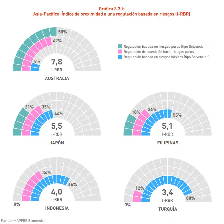 En la región de Asia-Pacífico se observan mercados más maduros como Australia y Japón, cuya legislación es más cercana a los sistemas de riesgos puros, con valores de 7,8 y 5,5, respectivamente. Filipinas también presenta una regulación avanzada, con un valor de 5,1, mientras que Indonesia (valor de 4), y especialmente Turquía (3,4) aún están más cercanas a las normas del tipo de riesgos básicos.