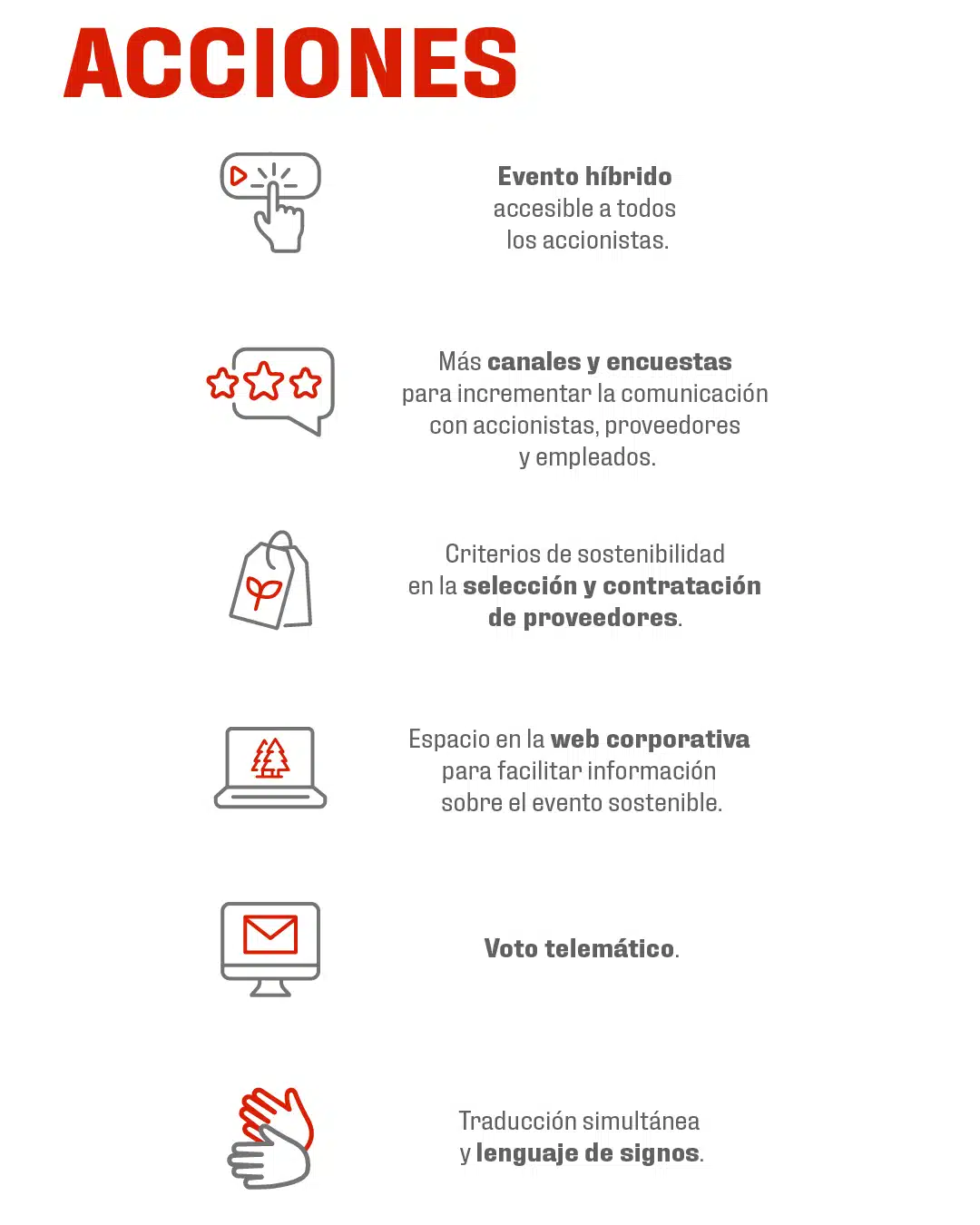 La junta será accesible a todos los accionistas en igualdad de condiciones; incluirá la traducción simultánea a lenguaje de signos (ODS 16); habilitará contenedores específicos para la gestión segregada de residuos; y utilizará materiales reutilizables (ODS 11 y 13).