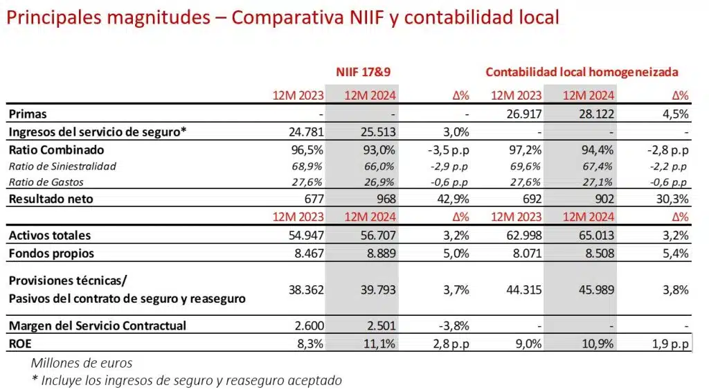 - Bajo las normas contables internacionales NIIF 17&9 el resultado atribuible se sitúa en 968 millones (+42,9%), el ROE supera el 11,1% y los fondos propios alcanzan los 8.889 millones.