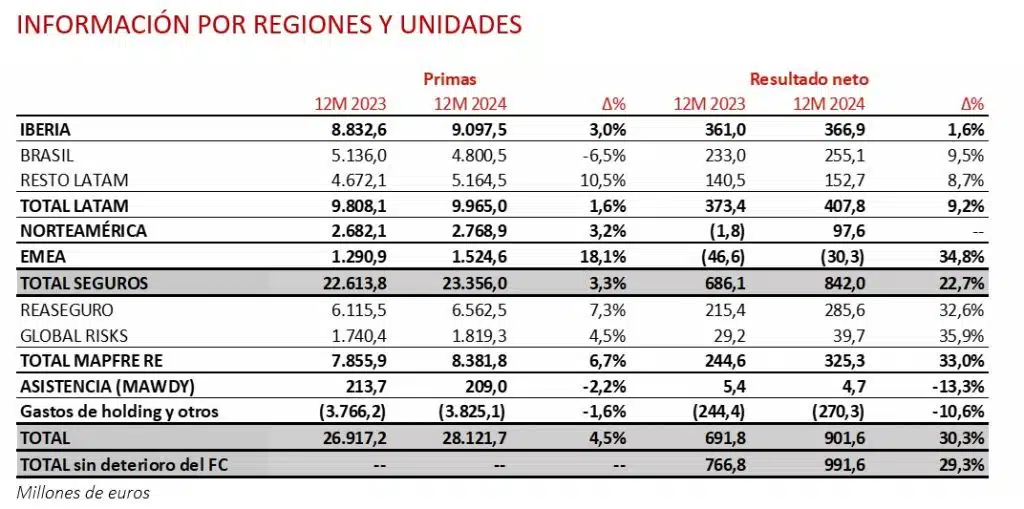 MAPFRE S.A. advierte que, salvo indicación contraria, las cifras y ratios que contiene este informe de actividad están presentadas bajo los principios contables vigentes en cada país, homogenizados para permitir la comparación y agregación entre unidades y regiones. Para ello se han aplicado ciertos ajustes, siendo los más relevantes los siguientes: la eliminación de la amortización de Fondo de Comercio en España y la eliminación de las reservas catastróficas en algunos países de Latinoamérica. En Malta y Portugal la contabilidad local aplica las NIIF 17 & 9. Pueden consultar las definiciones y métodos de cálculo de medidas financieras utilizadas en el presente informe bajo las NIIF 17&9 en el siguiente enlace: https://meteor-profit.live/media/accionistas/2024/2024-12-medidas-alternativas-rendimiento.pdf%3C/em%3E%3C/a%3E%3C/p%3E%3C/div%3E%3C/div%3E%3Cdiv class="et_pb_module et_pb_text et_pb_text_5 et_pb_text_align_justified et_pb_bg_layout_light">