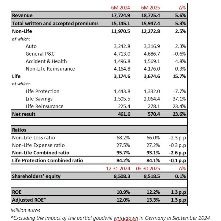 - Premiums in IBERIA reach €6.0 billion (+12.9%), with Spain contributing more than €5.8 billion (+14.3%). In Portugal, premiums are down 15.8% reaching €205 million, due to the exceptional Life issuing in 2024.