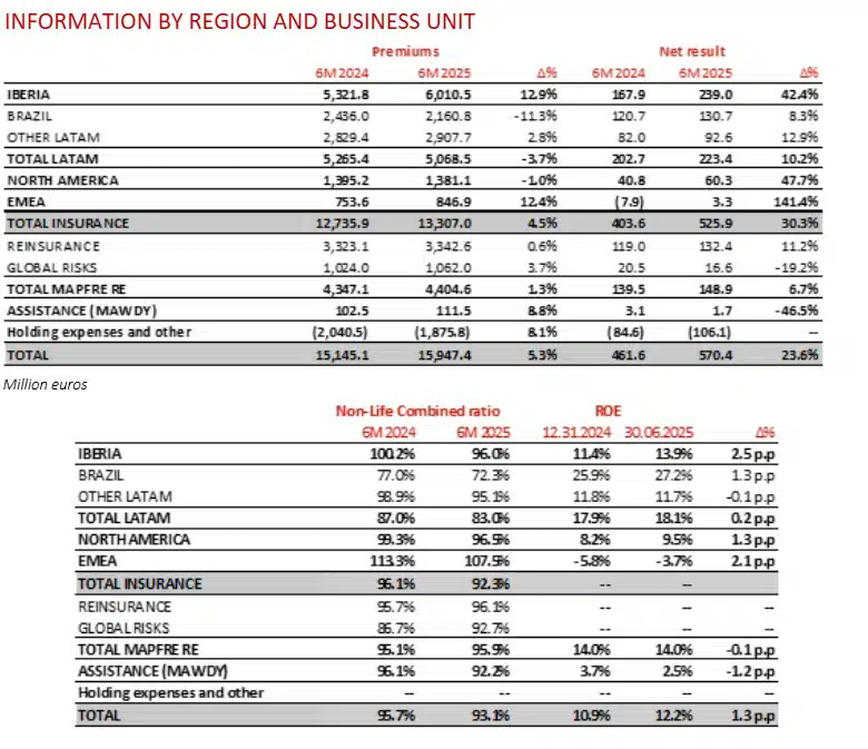 MAPFRE S.A. hereby informs that, unless otherwise indicated, the figures and ratios in this activity report are presented under the accounting principles in force in each country (which generally do not apply IFRS 17 & 9), homogenized for comparison and aggregation between units and regions. As such, certain adjustments have been applied, the most relevant being: the elimination of the goodwill amortization in Spain and the elimination of catastrophic reserves in some Latin American countries. MAPFRE Group presents its financial statements under the applicable international accounting standards (IFRS). Definitions and calculation methodology for financial measures under IFRS used in this report are available at the following link: https://meteor-profit.live/media/2025-06-alternative-performance-measures.pdf%3C/span%3E%3C/span%3E%3C/a%3E%3Cspan data-contrast="auto" xml:lang="EN-US" lang="EN-US" class="TextRun EmptyTextRun SCXW249308800 BCX8">