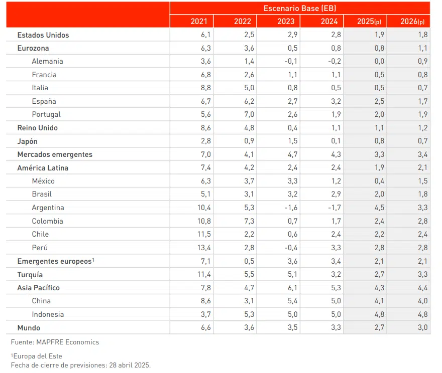 The scenario contemplated by MAPFRE Economics continues to envisage a global slowdown controlled by central banks. However, the emergence of new risks in the international scenario coming on the back of U.S. tariff policy has implied factoring in a degree of increased prudence and the contemplation of a possible decoupling toward less coordinated movements at a global level. The main macroeconomic variables will continue to be exposed to the effects of trade disputes, meaning their impact will depend on the policies defined in the coming months.