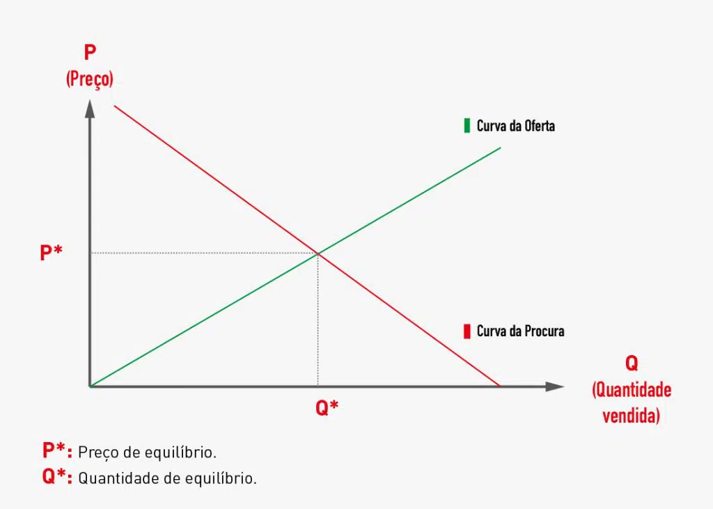 O ponto de intersecção entre a oferta e a demanda é chamado de equilíbrio de preços: um determinado bem ou serviço será entregue ao mercado (Q*) a um determinado preço (P*). A partir desse ponto inicial de equilíbrio, há quatro cenários possíveis: