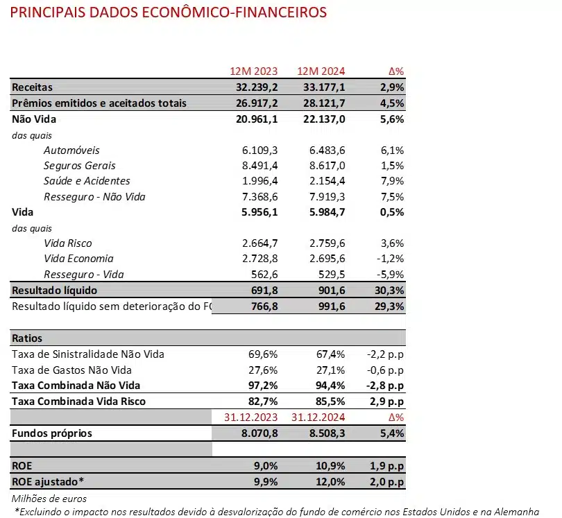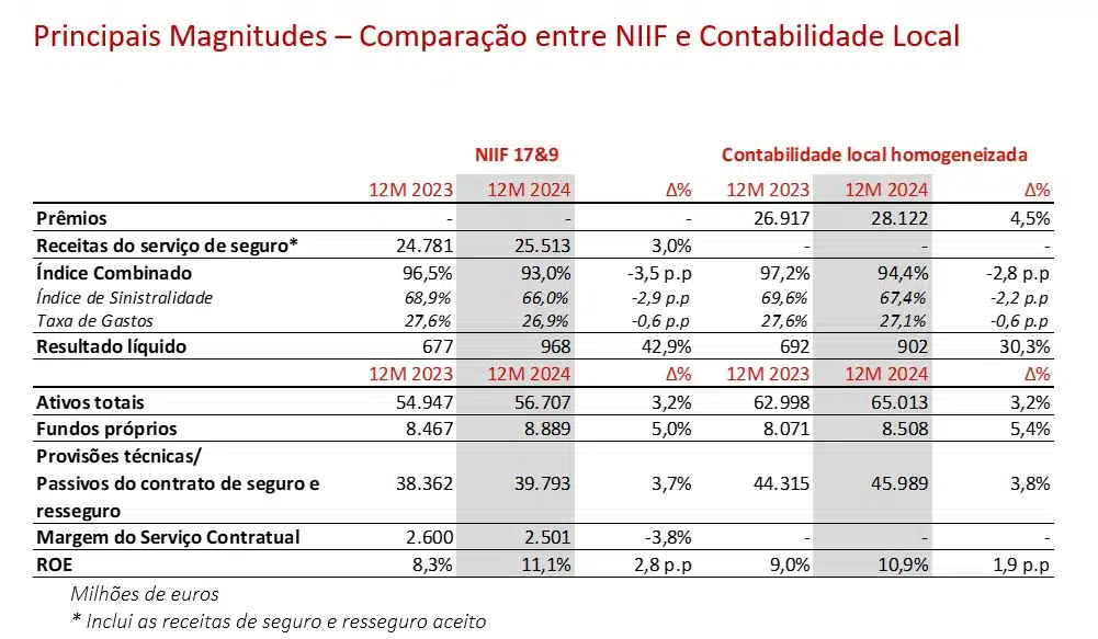 • Sob as normas contábeis internacionais NIIF 17 e 9, o resultado atribuível alcança 968 milhões (+42,9%), o ROE supera 11,1% e os fundos próprios chegam a 8,889 bilhões.